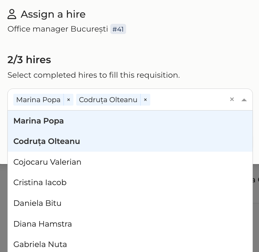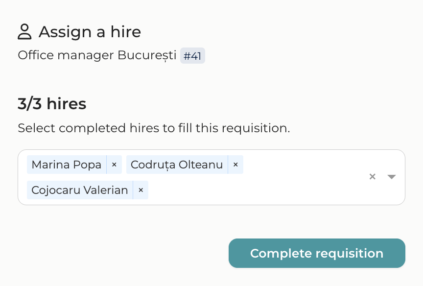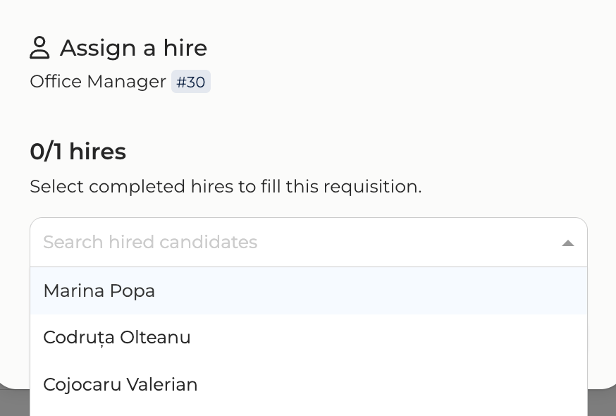 When you have found one or more people for a position, you can assign these hires to the requisition, in order to complete the process.