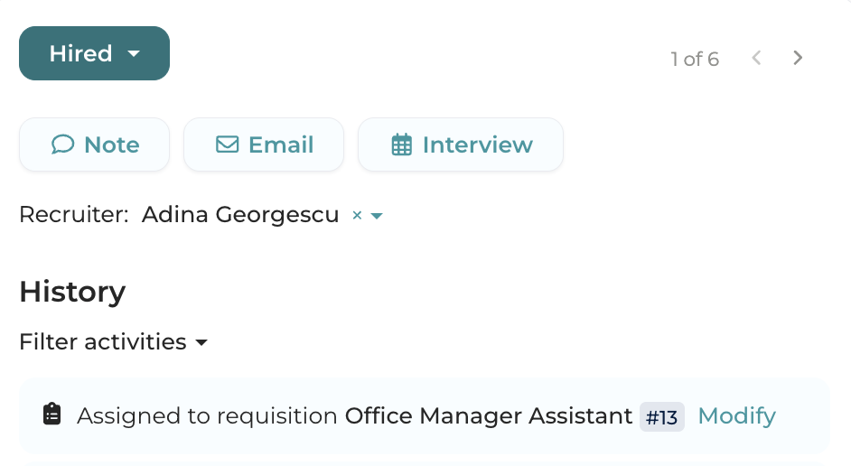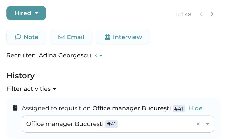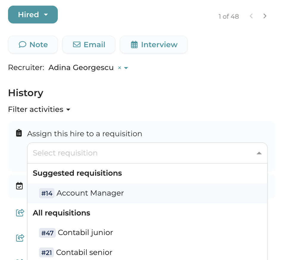 Once candidates are hired, you can assign them to a requisition directly from their profile. For this, click on Assign this hire to a requisition and choose the desired requisition from the dropdown list.