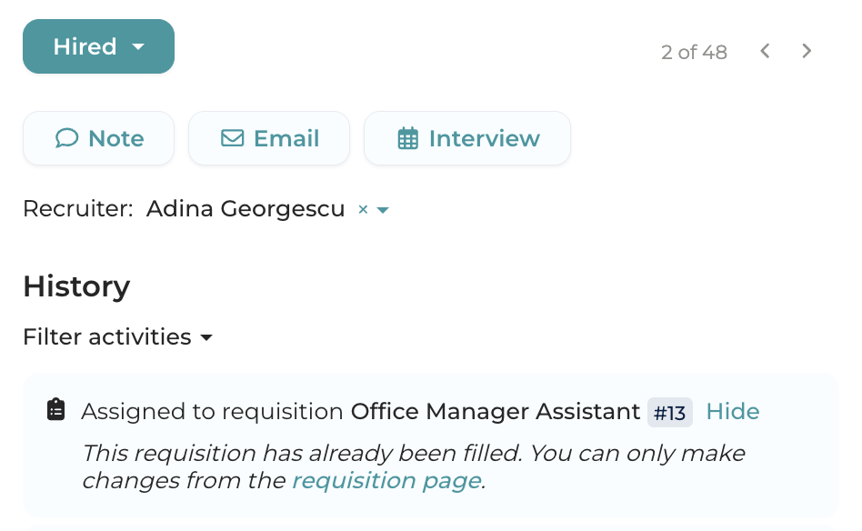 - If you associate a candidate with a requisition that has only one available position, the requisition will automatically change its status into "Filled“.