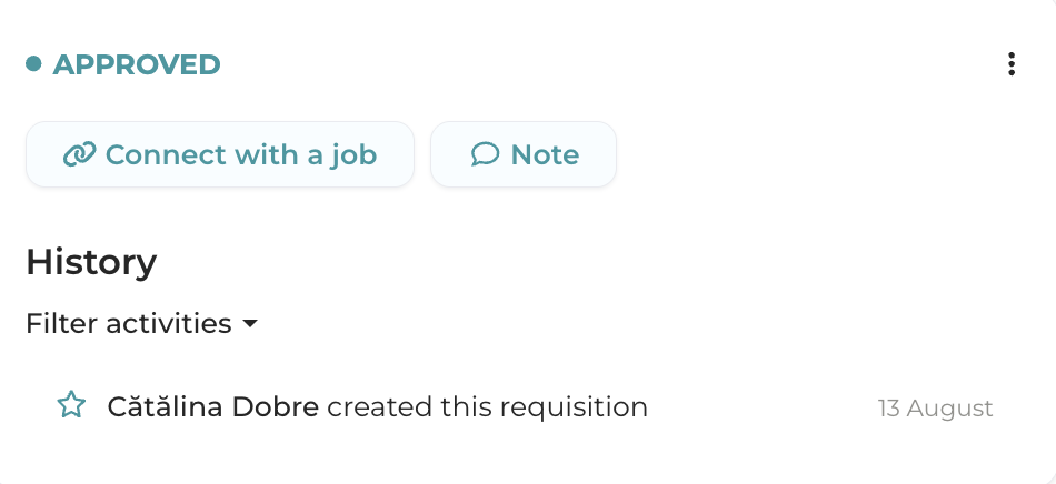 Once you have connected the requisition to a job, you will see this information in the requisition's history, highlighted in blue.