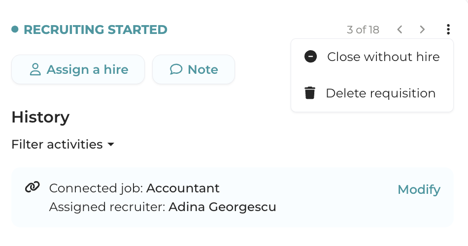 To change the requisition status into "Closed without hire" click the three vertical dots in the upper-right corner of the requisition page, and then select "Closed without hire".