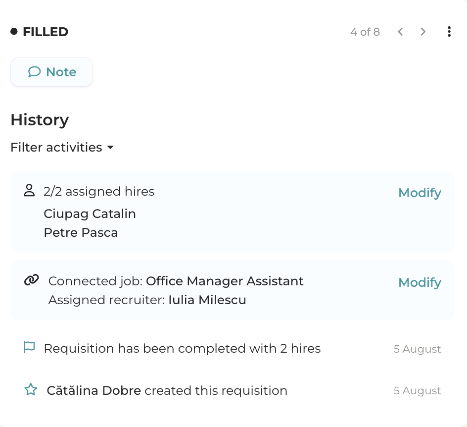 ÎIf you have completed the recruitment with fewer hires than initially planned, but you don’t want to move the requisition to the status "Closed without hire", you can reduce the number of available positions from the requisition page, and it will automatically switch into "Filled“.