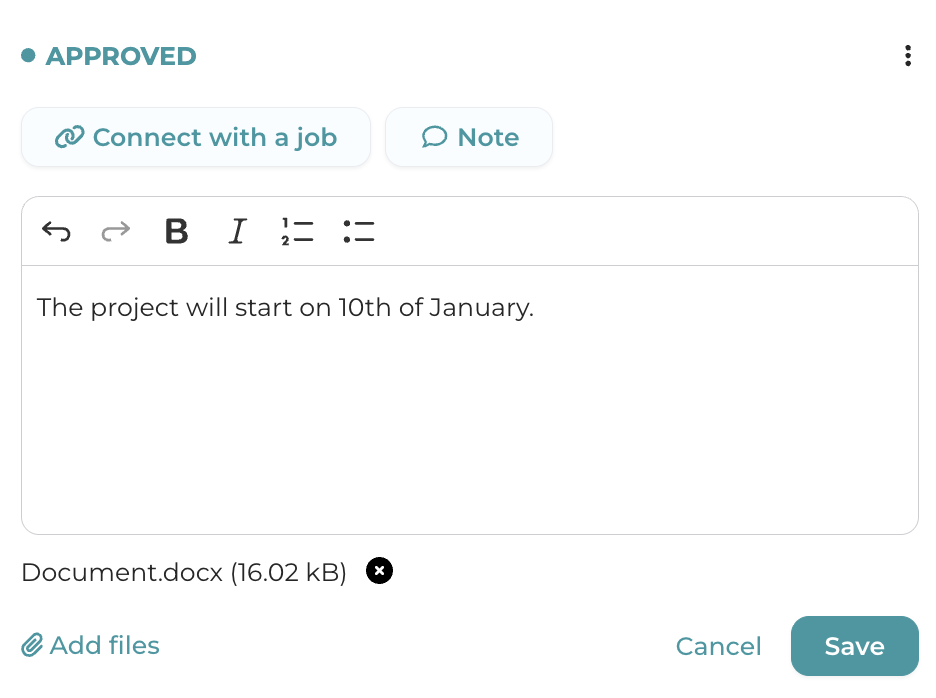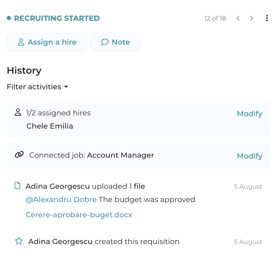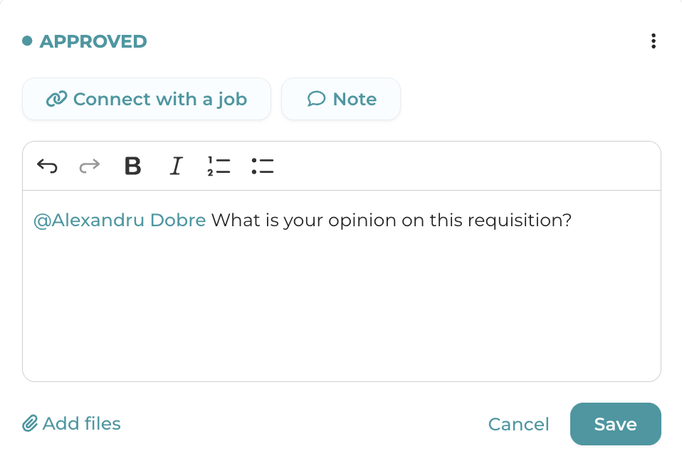 Collaborate with other colleagues Depending on the requisition status, you can perform various actions from its page:Leave a comment, mention a colleague or attach documents.Connect the requisition to a job to start hiring.Assign one or more hires.Close the requisition, with or without hires.Delete the requisition.On the right side of the requisition page, you can see all the actions performed with it, leave comments or see the comments left by other colleagues. Leave a comment You can leave comments by clicking on the Note icon in the upper right corner of the requisition page. A new window will open.Here you can type in the desired comment, or upload files by clicking on the Add files button, below the window that appears when you click Note. Mention other colleagues If you need another colleague’s input, you can mention them in a comment using @coworker's name.This way, your colleagues will receive an e-mail notification with the comment you've left and a link to the requisition page. See all activities On the right side of the requisition page, you can see all the actions taken, as well as all the comments, including any attached documents.You can see who left a comment or performed an action and when. If you wish, you can edit or delete comments you previously left. Next: Link the requisition to a job